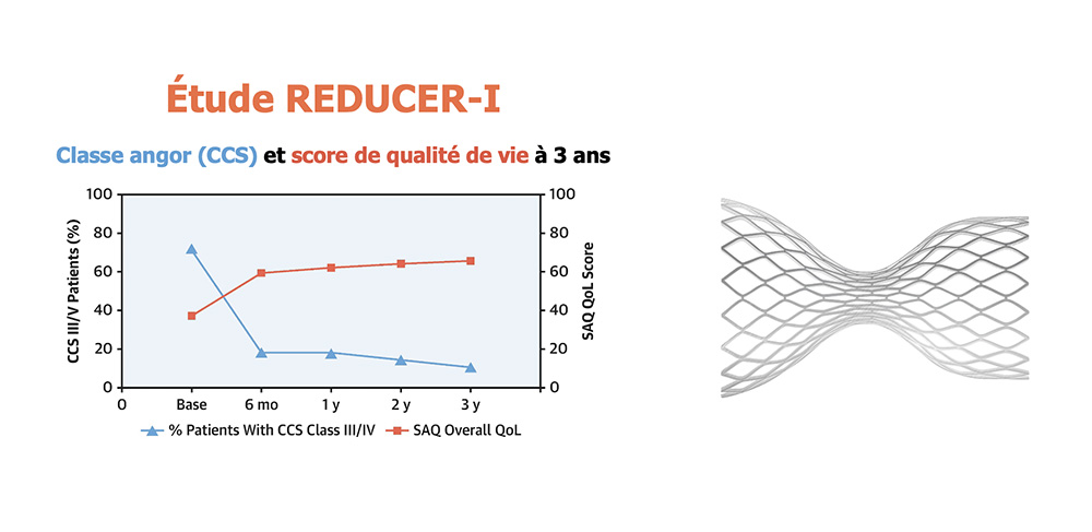 Plus récemment, l’étude ORBITA-COSMIC, qui est également une étude randomisée avec une procédure factice, a confirmé l’efficacité du dispositif sur les symptômes angineux (2). Ces résultats ont été confirmés en vie réelle par le registre multicentrique européen REDUCER-I, qui a inclut 382 patients (3). Ce registre rapporte une amélioration symptomatique ≥1 classe CCS chez 69,8% des patients et ≥2 classes chez 24,1% d’entre eux. Le bénéfice persistait à moyen terme et le profil de sécurité était favorable (taux de complications faible à 1,1%). L’ensemble des données confirme le caractère sûr de la procédure, la faisabilité et l’efficacité clinique du dispositif. Il convient toutefois de noter qu’une proportion minoritaire de patients ne présente pas d’amélioration clinique après l’implantation.