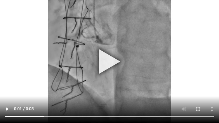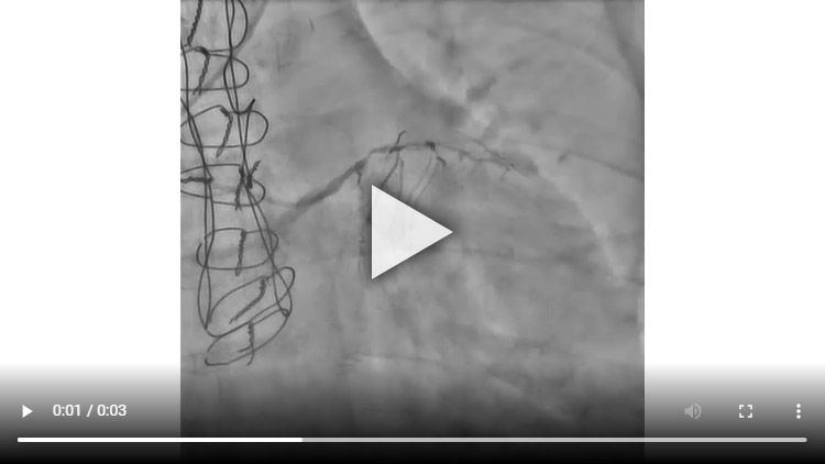 En effet, la désocclusion du réseau natif semble très complexe, et l’angioplastie de la mammaire nous semblait risquée, étant donné la fragilité des ostia mammaires, et également le fait que ce pont était son dernier vaisseau restant, le réseau natif étant subocclus.