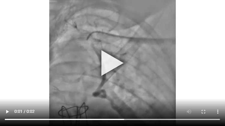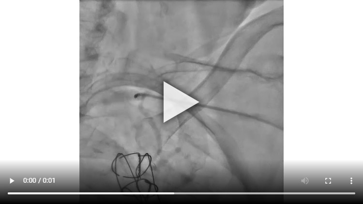 Il existait un doute sur une sténose à l’ostium de la mammaire interne gauche, avec un rétrécissement estimé visuellement à 50%, avec une légère ventricularisation des pressions lors de l’intubation sélective.