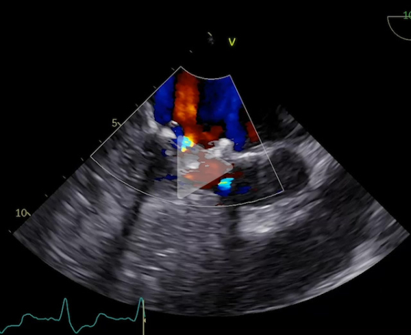 Vidéo 8 : échocardiographie 2D transoesophagienne sans et avec doppler couleur en incidence 3 cavités à 120°