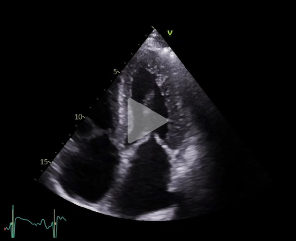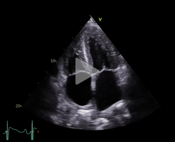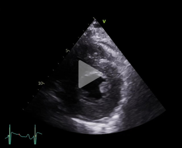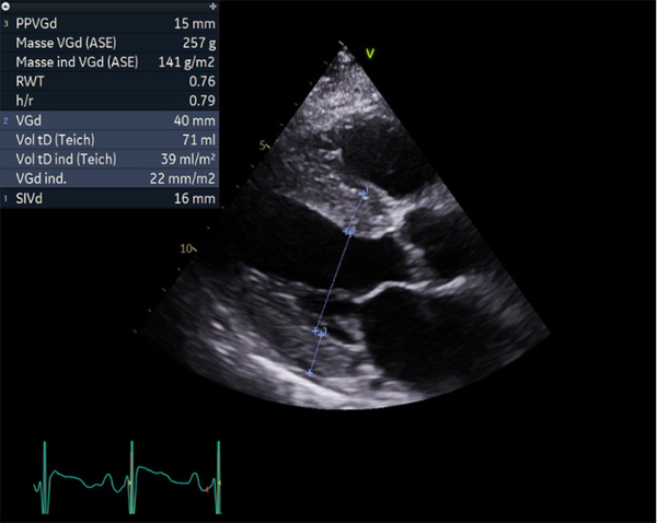 FEVG 40% en Simpson biplan, 45-50% visuellement. GLS -7%. Hypokinésie des bases et hyperkinésie de l'apex. VG non dilaté (DTDVG = 35mm, VTDVG =54ml/m2), hypertrophié (SIV = 18.5mm, PPVG = 19mm).